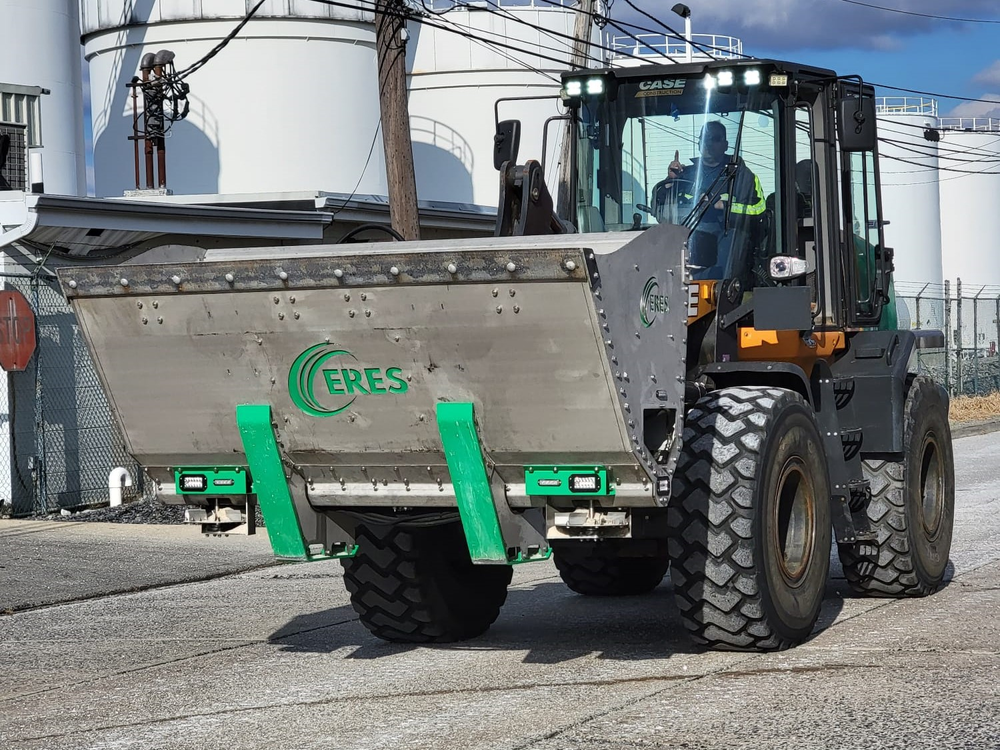 A CERES bucket is an ECF proprietary engineered salting bucket. It mounts on our large wheel loaders and can scoop and salt, thus eliminating expensive salting trucks and their associated drivers. This reduces Amazon's costs because it maximizes heavy equipment utilization.