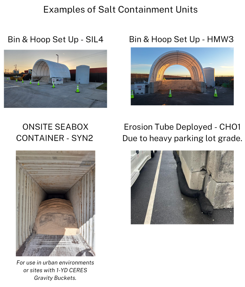 A second option for smaller sites or urban locations is to place a sea box on the site and fill it with salt. This option is only available if the site will be loaded with a skid-loader equipped with a 1.0 cubic yard CERES bucket.