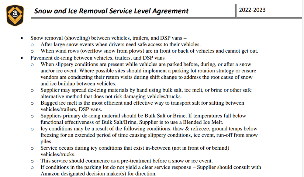 This service requires coordination and approval from onsite leaders. Generally, a plan is established before winter begins based on the specific site's needs and geographic location. Then, the program is adjusted on a storm-by-storm basis if and when needed. See decision making procedures below.